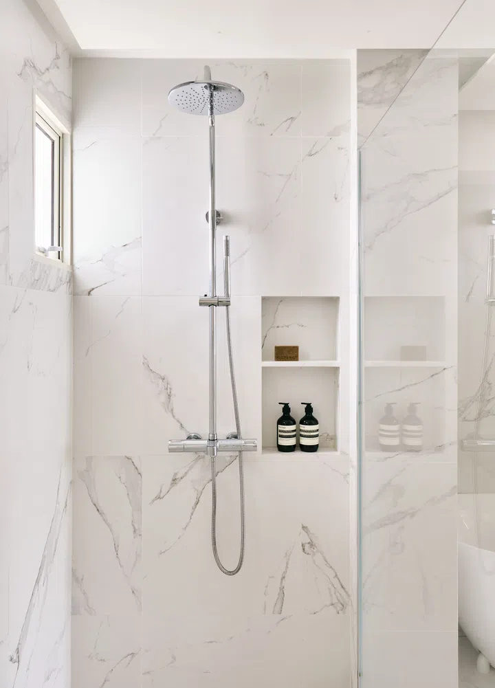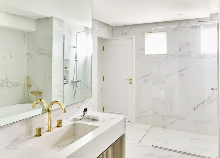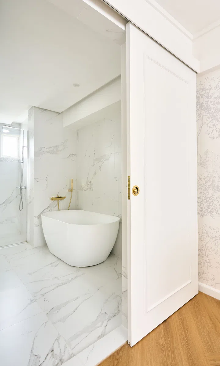 The common and master bathrooms have been combined into one large bathroom equipped with a spacious shower compartment and a freestanding bathtub. The minimalist, all-white aesthetics aptly captures the refined luxury of a French villa. The spa-like retreat was designed for the homeowners to relax and recharge.