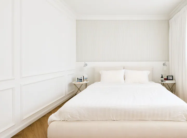 More wainscoting can be found on the wall beside the bed in the master bedroom on the second storey. Together with the fluted panels behind the headboard, they add visual interest and a sense of depth to the white colour palette.